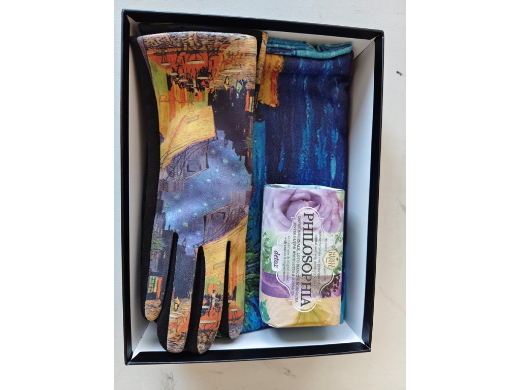Sada šály, rukavic a luxusního mýdla v dárkové krabičce.