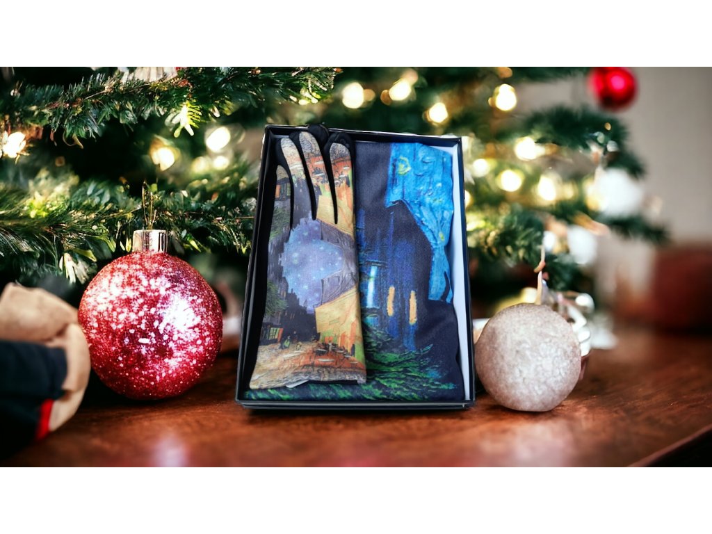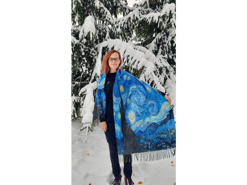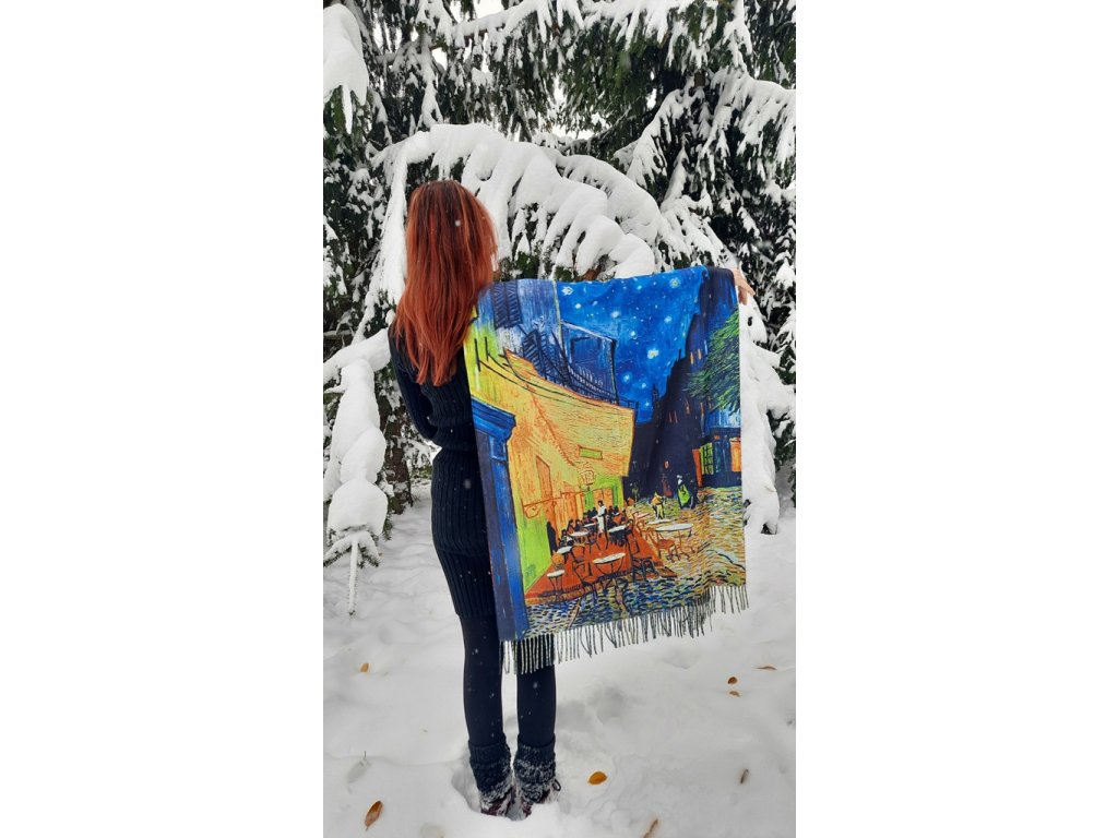 Oboustranná kašmírová šála s obrazem Vincenta van Gogha - Hvězdná noc. Z druhé strany šály je obraz Vincenta van Gogha - Terasa kavárny v noci.