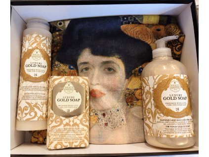Sada šály a mýdel od značky Nesti Dante v dárkové krabičce. Oboustranná kašmírová šála s obrazem Gustav Klimt - Zlatá Adele, z druhé strany je obraz Polibek.