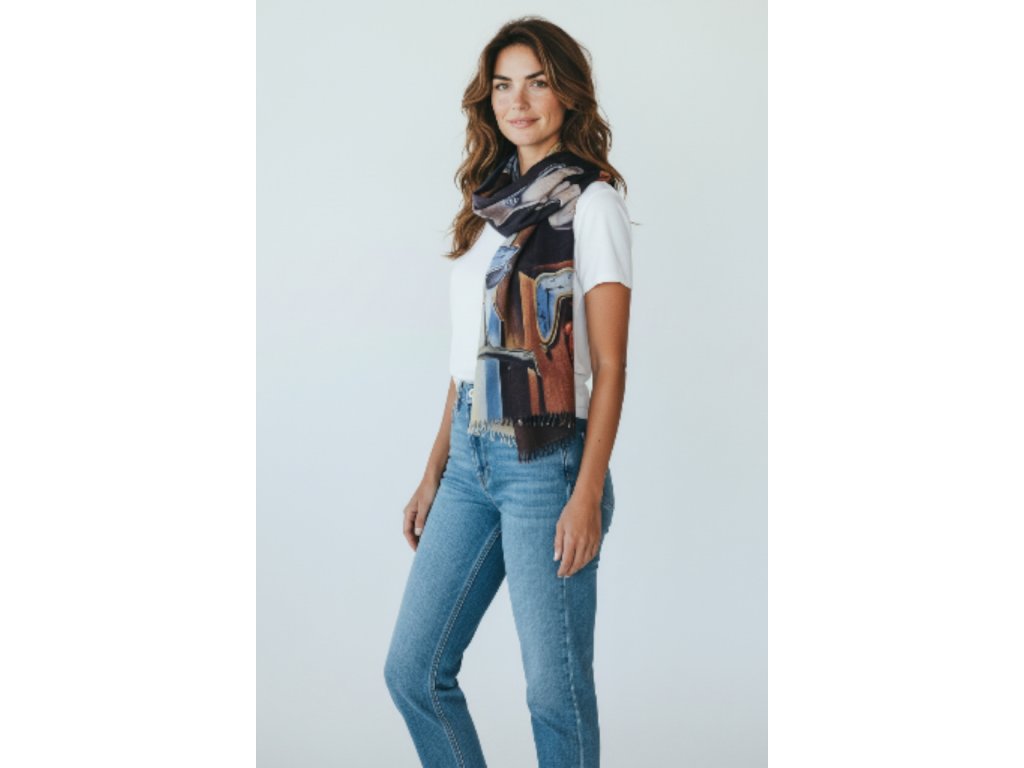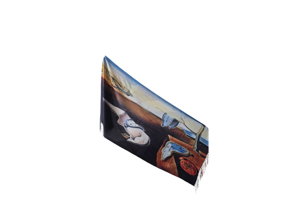 Oboustranná šála s obrazem Hodin od Salvadora Dalího. Z druhé strany je... něco