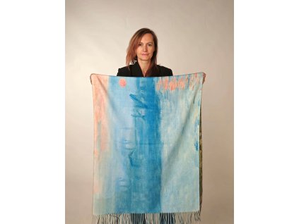 Oboustranná kašmírová šála s obrazem Vincenta van Gogha - Květ mandloně. Z druhé strany šály je abstrakce neznámého autora. Tip: K šále je možné koupit i extra jemné...