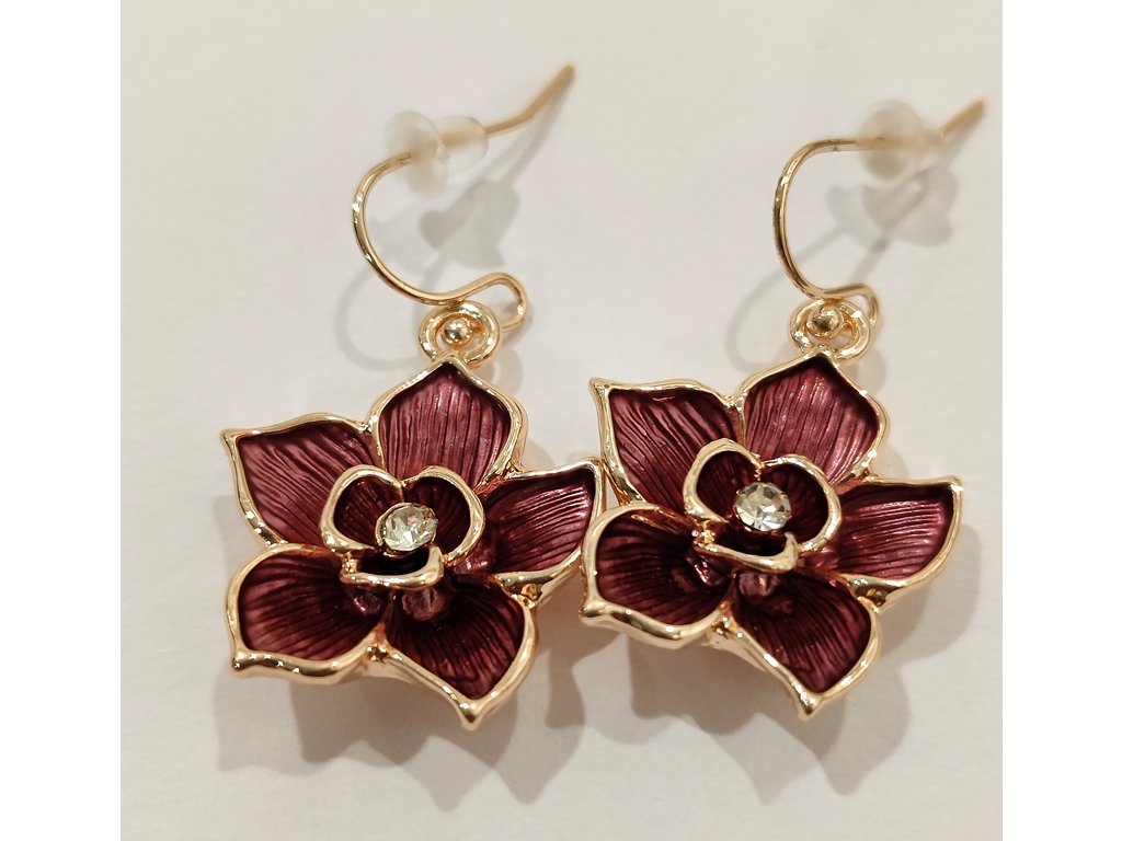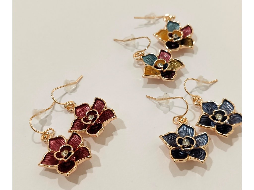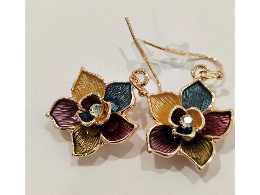 Nádherné náušnice ve tvaru malých kvítků v několika barvách, vyrobené ze slitin zinku, které jsou pokovené do barvy žlutého zlata. Díky praktickému háčku jsou pohodlné na nošení. Tyto elegantní náušnice se hodí pro každou příležitost a přinesou vašemu stylu šmrnc a originalitu.