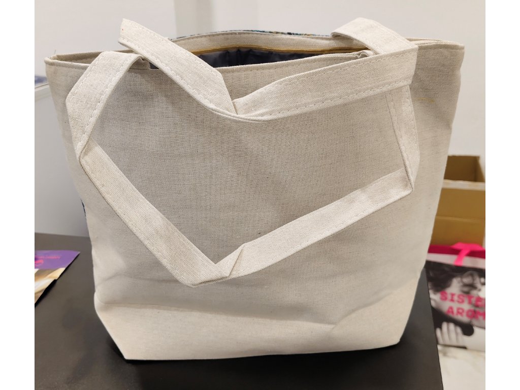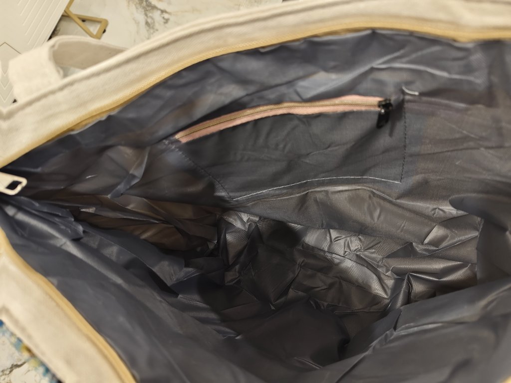 Plážová taška je z pevného a odolného plátěného materiálu. Vnitřek je z omyvaltelného materiálu. Uvntř je malá kapsička.
