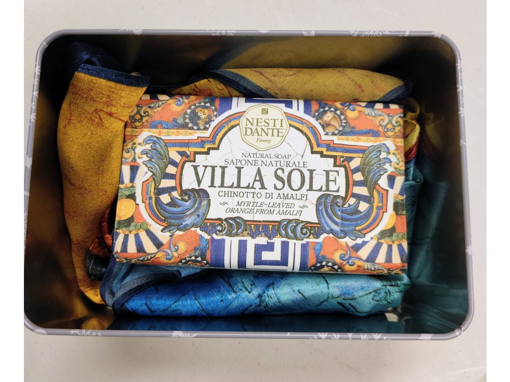 Šátek z pravého hedvábí s luxusním mýdlem v dárkovém boxu.