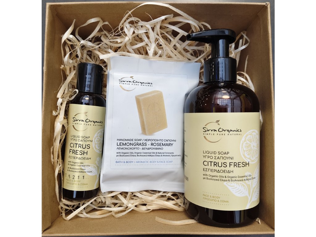 Sada v dárkové krabičce s mašlí obsahuje přírodní, řemeslná mýdla od řecké značky Sirra Organics: