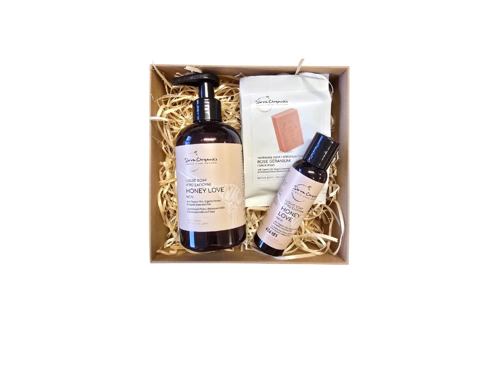 Sada v dárkové krabičce s mašlí obsahuje přírodní, řemeslná mýdla od řecké značky Sirra Organics: